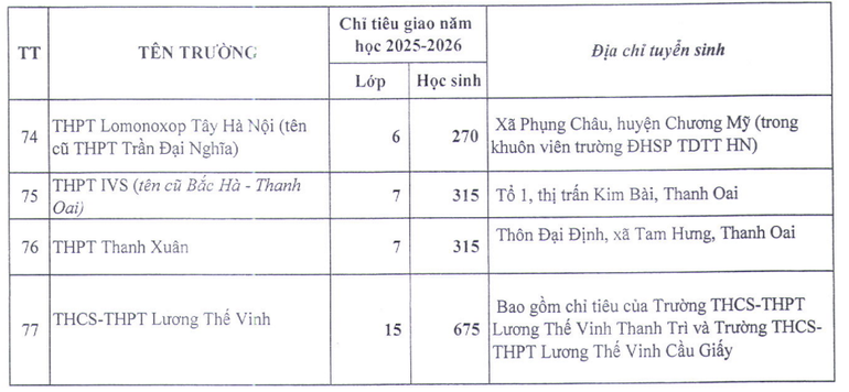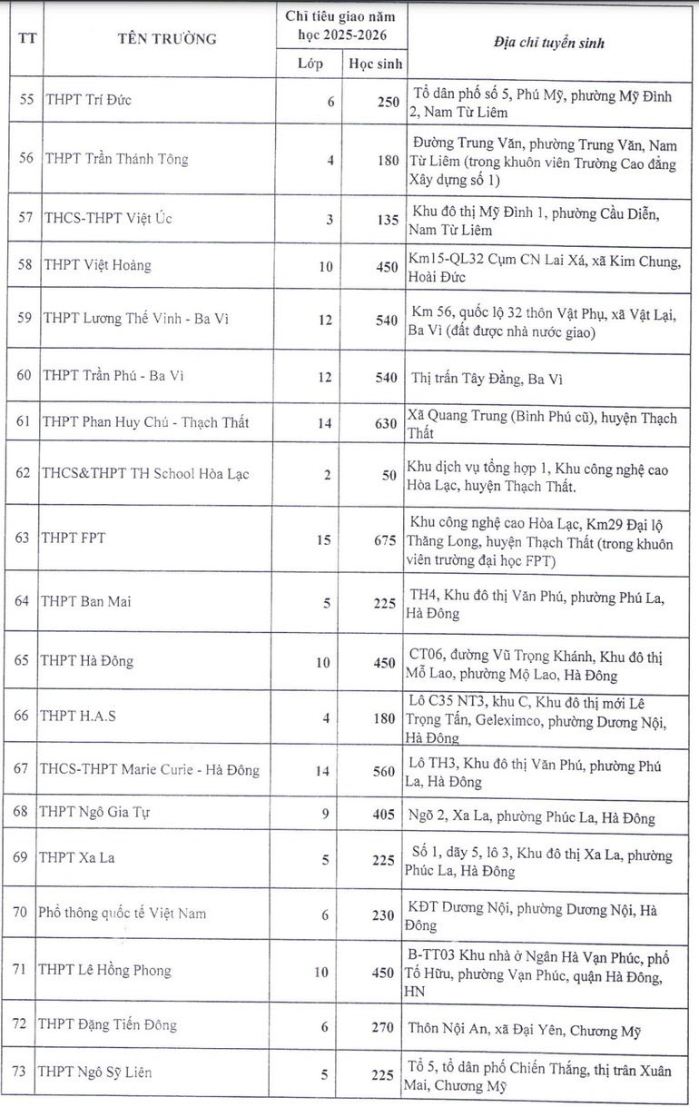 Chỉ tiêu tuyển sinh của các trường tư thục tại Hà Nội năm học 2025-2026 như sau:
