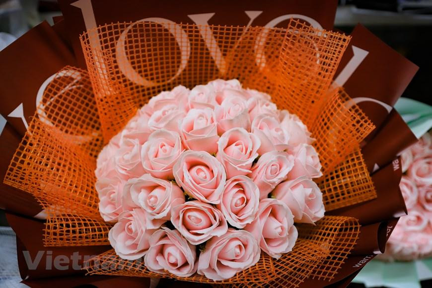 Bên cạnh hoa tươi, một số cửa hàng còn có những mẫu hoa giả bằng giấy để cho khách hàng lựa chọn.