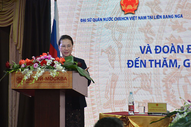 Phát biểu tại cuộc gặp, Chủ tịch Quốc hội Nguyễn Thị Kim Ngân bày tỏ xúc động khi được gặp gỡ và đón nhận những tình cảm ấm áp của cộng đồng người Việt Nam tại LB Nga ngay khi vừa bước xuống máy bay tại sân bay Vnukovo ở thủ đô Moscow. Chủ tịch cũng bày tỏ vui mừng khi được đến thăm và nói chuyện với cộng đồng người Việt tại Nga.