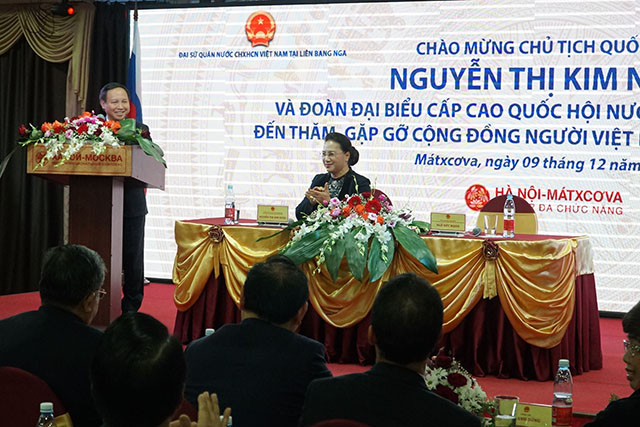 Trong phát biểu của mình, Đại sứ Việt Nam tại LB Nga Ngô Đức Mạnh cho biết, bà con người Việt tại Nga rất vui mừng khi được đón Chủ tịch Quốc hội Nguyễn Thị Kim Ngân và đoàn đại biểu cấp cao tại LB Nga. Cộng đồng người Việt Nam tại LB Nga rất tự hào khi luôn nhận được sự quan tâm sát sao từ các đồng chí lãnh đạo cấp cao của đất nước. Đại sứ Ngô Đức Mạnh khẳng định cộng đồng người Việt Nam tại LB Nga là một cộng đồng đoàn kết và hoạt động rất tích cực, có nhiều đóng góp về quê nhà, góp phần phát triển nền kinh tế đất nước. Bên cạnh đó, hoạt động của cộng đồng ta tại LB Nga luôn được các cấp chính quyền nước sở tại ủng hộ, tạo điều kiện để cộng đồng hoà nhập tốt, bà con ta được sinh sống, học tập và làm ăn tuân thủ luật pháp LB Nga.