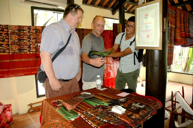 Du khách phương tây với sản phẩm dệt thổ cẩm.