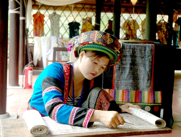 Vẽ sáp trên vải thổ cẩm của dân tộc Mông, huyện Quản Bạ (Hà Giang).