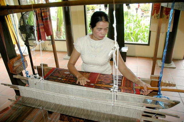 Thiếu nữ Chăm với kỹ thuật dệt hoa văn cổ đám cưới.