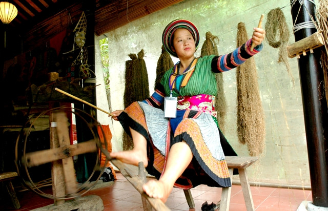 Thiếu nữ Mông quay tơ dệt thổ cẩm.