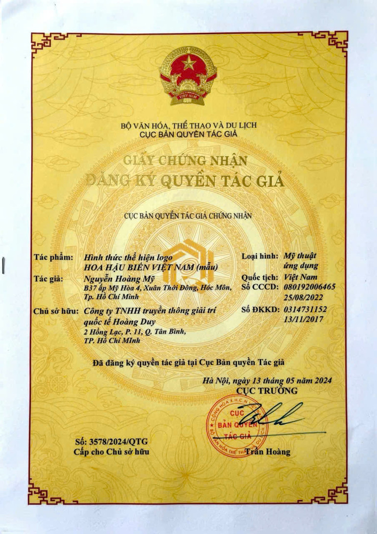 Ở góc độ bản quyền tác giả, logo “Hoa hậu Biển Việt Nam 2024” do Công ty Hoàng Duy sáng tạo và đăng ký bảo hộ dưới dạng tác phẩm mỹ thuật ứng dụng và được Cục Bản quyền tác giả (Bộ Văn hóa, Thể thao và Du lịch) cấp giấy chứng nhận đăng ký quyền tác giả số 3578/2024/QTG vào ngày 13/5/2024.