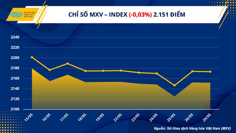 Dữ liệu từ Sở Giao dịch Hàng hóa Việt Nam (MXV) cho thấy, chỉ số MXV-Index chốt phiên hôm qua ở mức 2.151 điểm, chỉ giảm 1 điểm so với ngày trước đó, phản ánh diễn biến phân hóa của giá hàng hóa nguyên liệu thế giới.