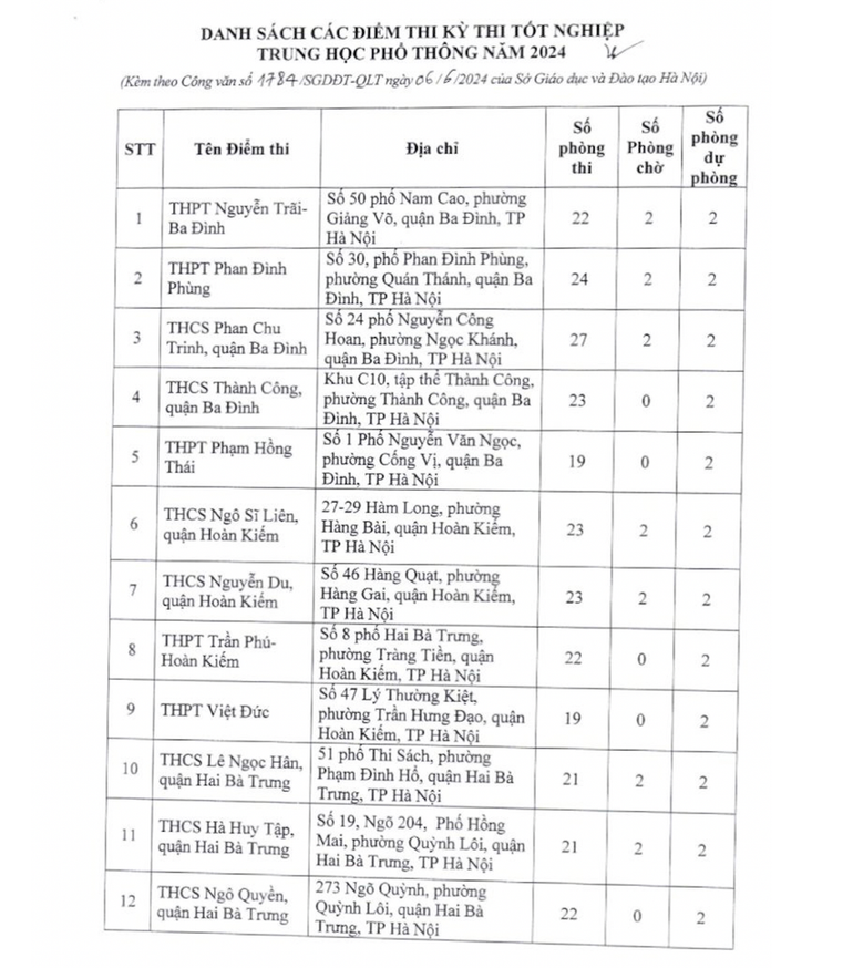 Chi tiết danh sách 196 điểm tổ chức Kỳ thi tốt nghiệp trung học phổ thông năm 2024 của Hà Nội, mời xem tiếp tại đây.