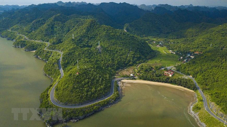 Đường ven biển Cát Bà dài khoảng 25km, kéo dài từ bến phà Cái Viềng vào trung tâm thị trấn Cát Bà trông như một dải lụa mềm và là một trong những cung đường ven biển đẹp nhất miền Bắc. (Ảnh: TTXVN)