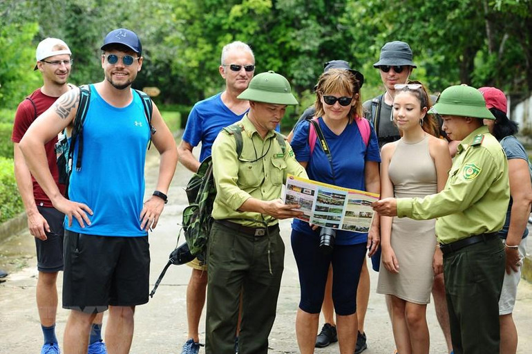 Lực lượng kiểm lâm tuyên truyền công tác bảo tồn thiên nhiên cho du khách. (Ảnh: TTXVN)