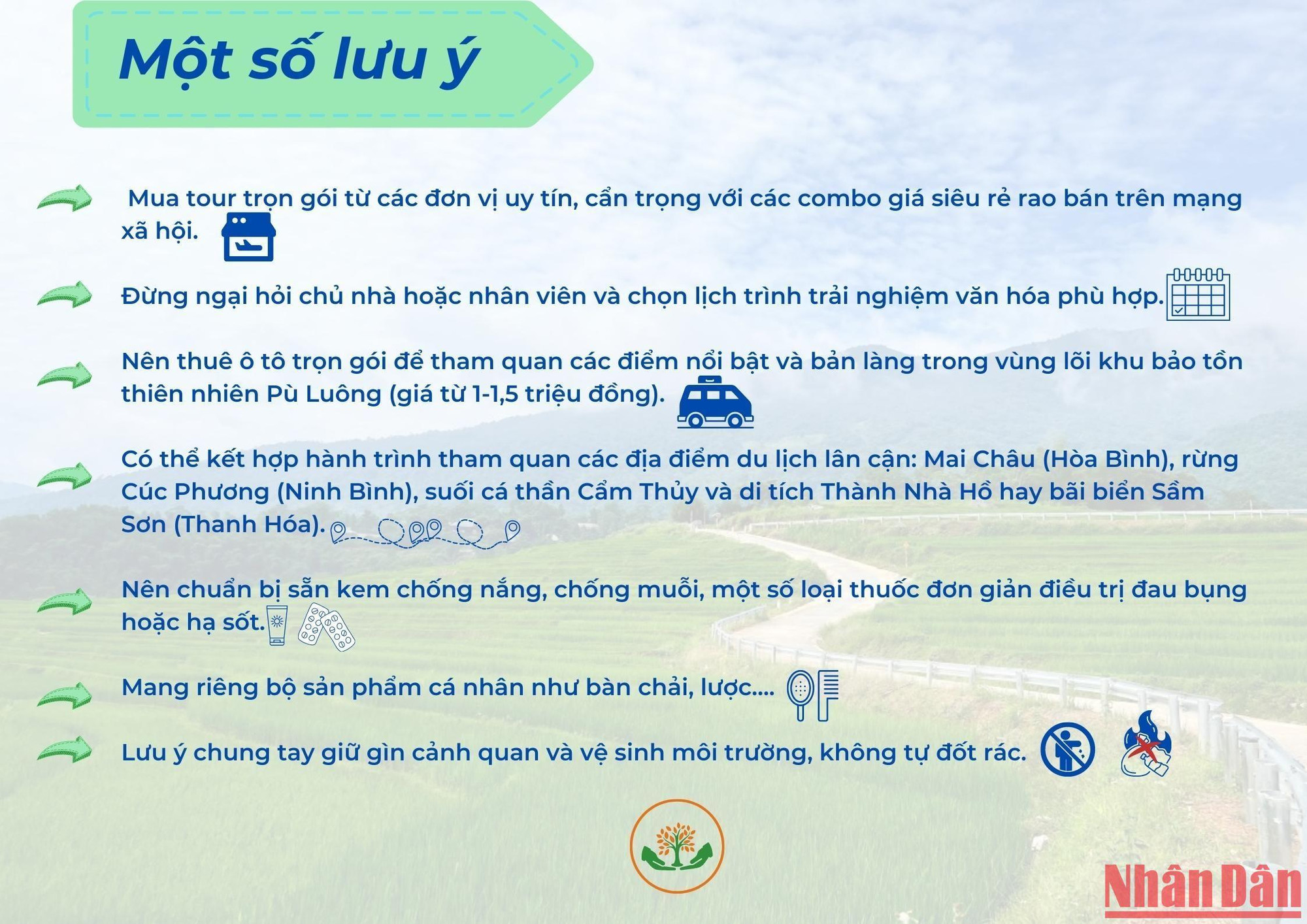 Hằng năm, Pù Luông có hai mùa lúa chín vàng vào cuối tháng 5, đầu tháng 6 và cuối tháng 9, đầu tháng 10. Đây cũng là hai dịp cao điểm nhất, thu hút đông khách du lịch nội địa cả đi tour lẫn đi tự túc. Hoặc khoảng thời gian trước đó (tháng 3,4 và tháng 7,8) cũng rất đẹp với màu xanh rờn của cây cối, lúa non... thích hợp cho du khách đi tránh nóng, nghỉ ngơi cuối tuần.