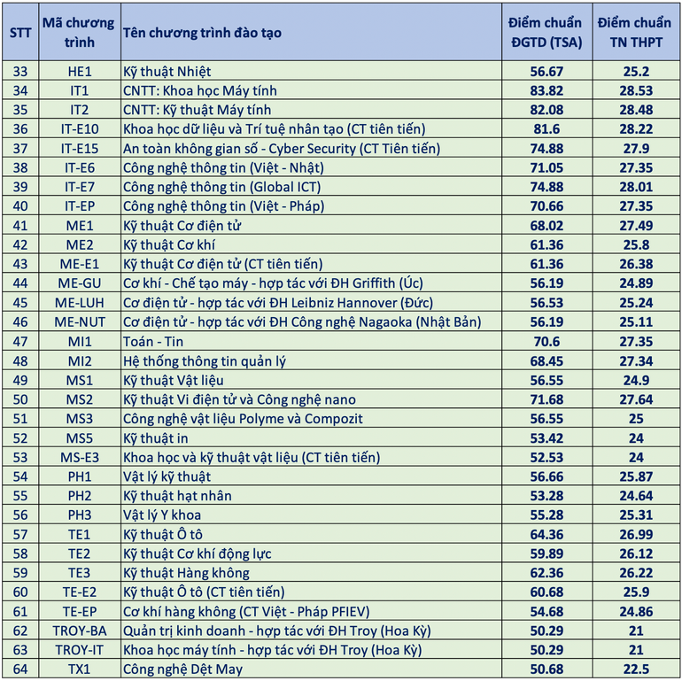 Chương trình Khoa học máy tính (IT1) lấy điểm chuẩn cao nhất là 83,82 đối với điểm thi đánh giá tư duy (TSA) và 28,53 đối với điểm thi tốt nghiệp trung học phổ thông. Chương trình Kỹ thuật máy tính (IT2) lấy điểm chuẩn là 82,08 đối với điểm thi đánh giá tư duy (TSA) và 28,48 đối với điểm thi tốt nghiệp trung học phổ thông, cao thứ hai năm nay. Kế đó chương trình Khoa học dữ liệu và Trí tuệ nhân tạo (IT-E10) với số điểm tương ứng là 81,6 và 28,22 điểm.