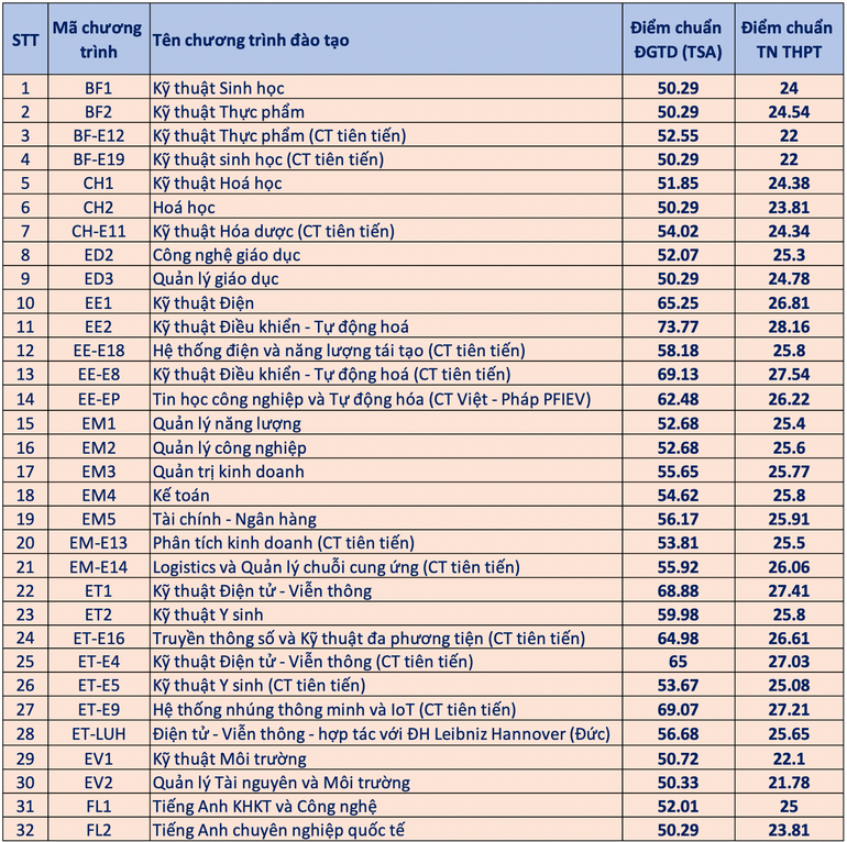 Điểm chuẩn trúng tuyển vào các chương trình đào tạo của Đại học Bách khoa Hà Nội năm 2024 như sau: