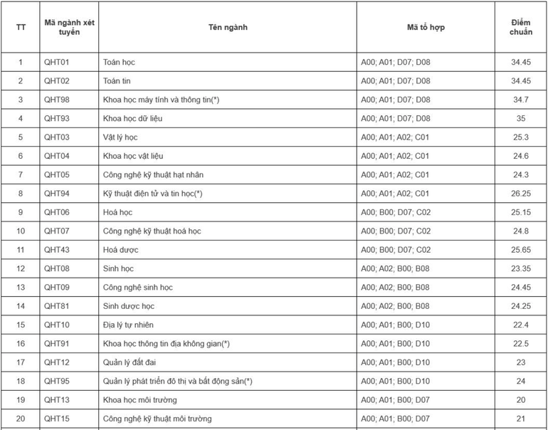 4 ngành: Toán học, Toán tin, Khoa học máy tính và thông tin(*), Khoa học dữ liệu: Điểm chuẩn tính theo thang điểm 40 là tổng điểm môn Toán (nhân hệ số 2) cộng với điểm hai môn còn lại trong tổ hợp xét tuyển và cộng với điểm ưu tiên khu vực, đối tượng (nếu có, đã quy sang thang điểm 40).