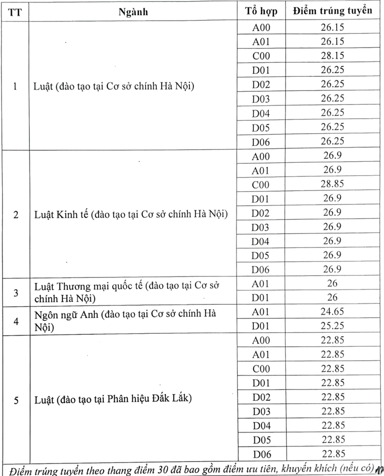 Tối 17/8, Trường đại học Luật Hà Nội công bố điểm chuẩn trúng tuyển trình độ đại học hình thức đào tạo chính quy năm 2024 (Khóa 49) theo phương thức xét tuyển dựa trên kết quả thi tốt nghiệp THPT năm 2024.