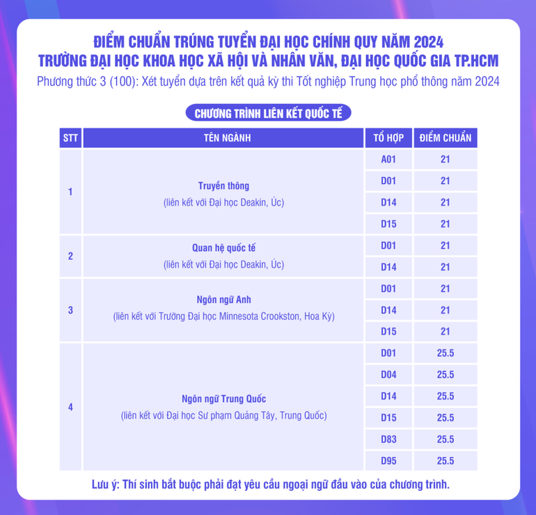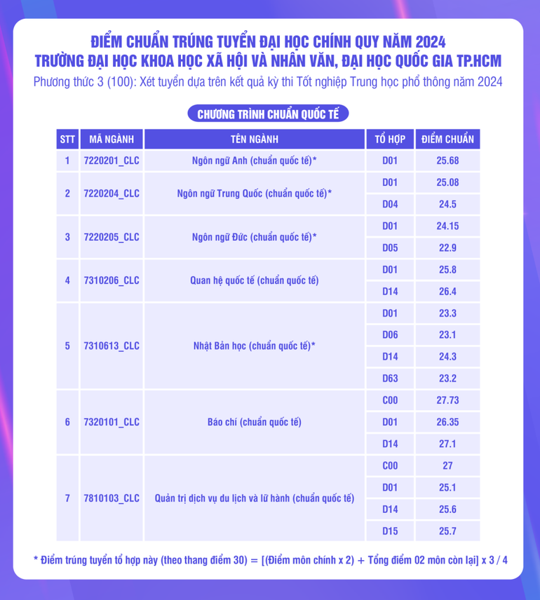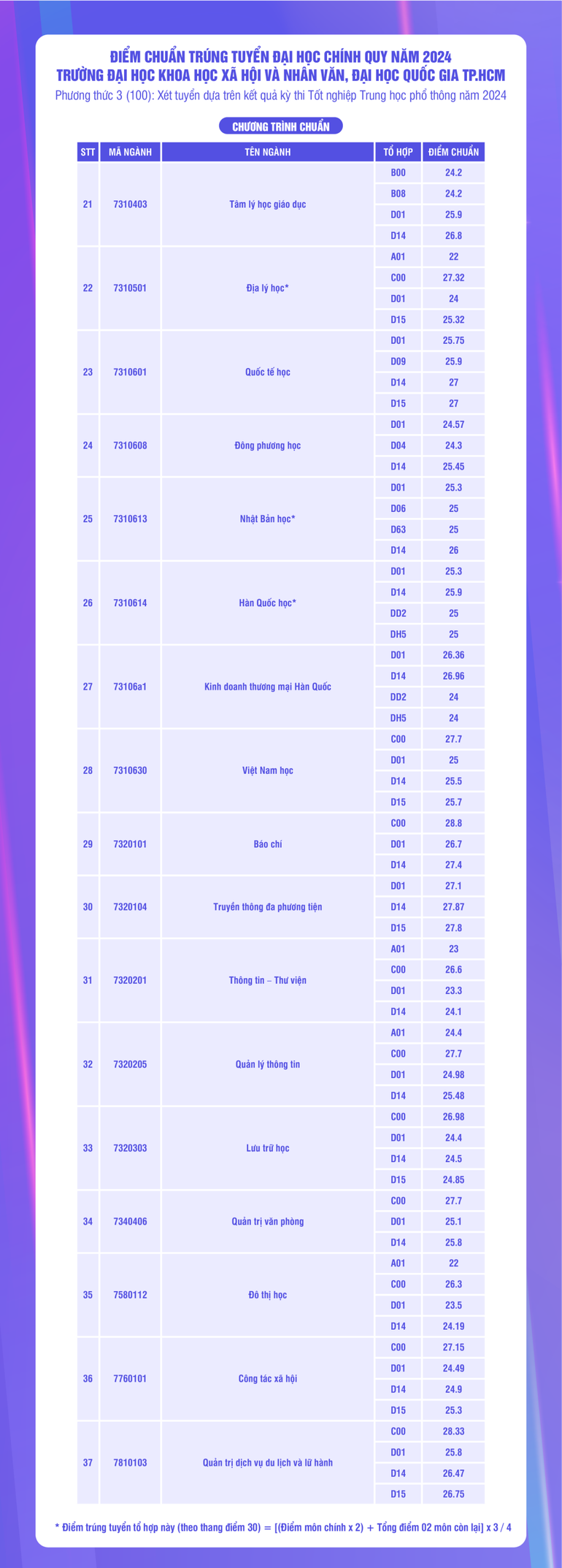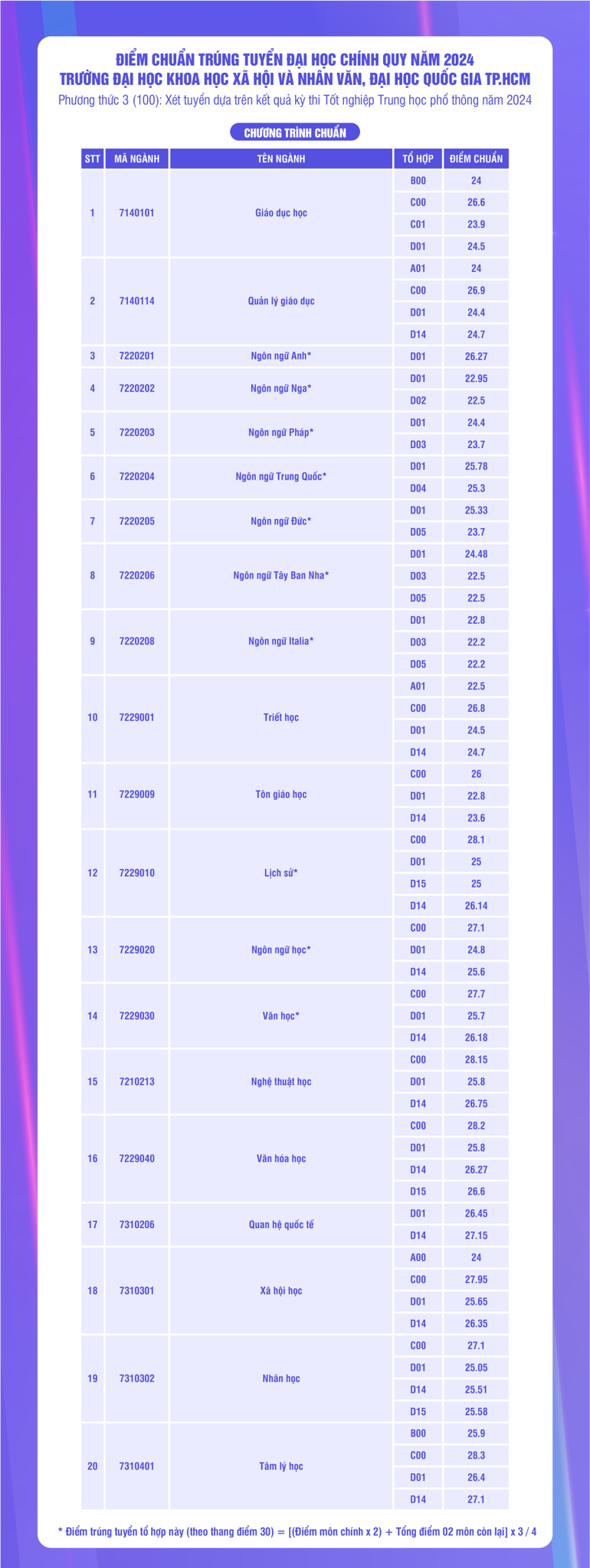 Ngày 18/8, Trường đại học Khoa học xã hội và Nhân văn (Đại học Quốc gia Thành phố Hồ Chí Minh) công bố điểm chuẩn trúng tuyển đại học chính quy bằng phương thức xét tuyển kết quả thi tốt nghiệp trung học phổ thông năm 2024.