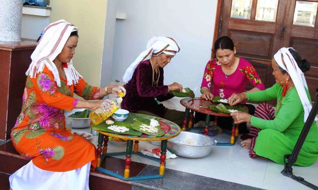 Phụ nữ Chăm làm các loại bánh cổ truyền để cúng tạ tổ tiên ông bà trong lễ hội Ramưwan.