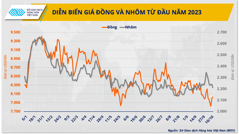 Theo số liệu từ Sở Giao dịch Hàng hóa Việt Nam (MXV), kết thúc phiên giao dịch ngày 10/10, giá đồng trên Sở COMEX giảm 0,33% xuống 8.011 USD/tấn, giá nhôm trên Sở LME giảm 1,29% xuống 2.212 USD/tấn. Giá của cả hai mặt hàng đều đang thấp hơn so đầu năm do sức cầu của Trung Quốc, nhà tiêu thụ lớn nhất thế giới liên tục suy yếu. Bên cạnh đó, việc đồng USD mạnh lên cũng khiến chi phí thu mua đắt đỏ hơn.