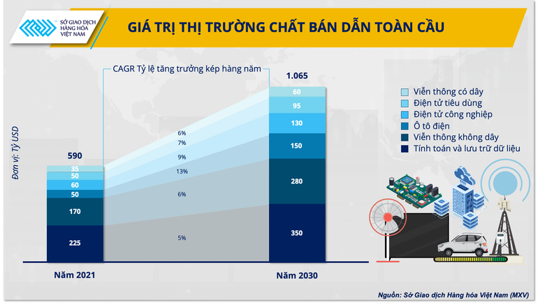 Trong các năm trở lại đây, ngành công nghiệp chất bán dẫn bùng nổ với quy mô và tốc độ tăng trưởng nhanh chóng. Báo cáo của McKinsey cho biết thị trường chất bán dẫn toàn cầu được ước tính sẽ vượt mốc 1.000 tỷ USD vào năm 2030, với tốc độ tăng trưởng trung bình hằng năm từ 6-8%. Khoảng 70% giá trị tăng trưởng được thúc đẩy bởi 3 lĩnh vực: ô-tô điện; tính toán, lưu trữ dữ liệu và viễn thông không dây.