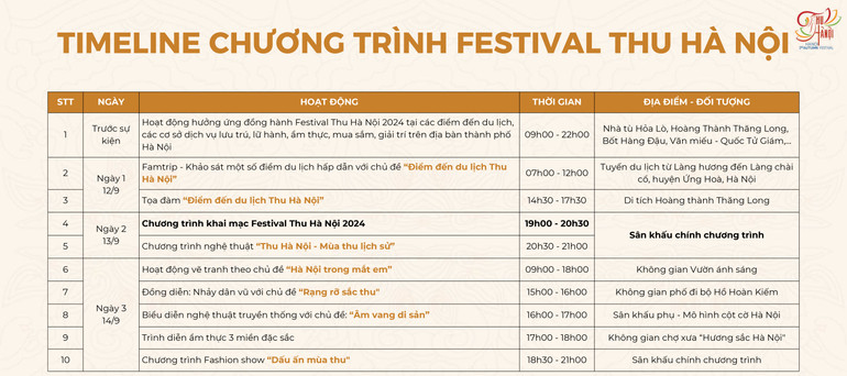 Tại buổi họp báo giới thiệu về chương trình diễn ra ngày 5/9, đại diện Ban tổ chức cho biết, Festival Thu Hà Nội lần thứ hai năm 2024 bao gồm nhiều nội dung phong phú, đặc sắc: Mô hình Cổng chào tái hiện hình ảnh Hà Nội nhộn nhịp ngập trong rừng cờ hoa chào đón đoàn quân chiến thắng trở về, mô hình “Cột cờ Hà Nội”, “Ga Hàng Cỏ - Chuyến tàu lịch sử”, “Ô Quan Chưởng”, “Vườn ánh sáng” được sắp đặt, dàn dựng thành các không gian trưng bày, tiểu cảnh giới thiệu các điểm đến du lịch hấp dẫn vào mùa thu như Cầu Long Biên, phố cổ Hà Nội; Không gian giới thiệu ẩm thực Hà Nội tại khu vực nhà Bát Giác với các món ăn truyền thống như cốm làng Vòng, bánh cốm Hàng Than, trà sen Tây Hồ, cà phê phố cổ, bánh mì Phố, nem nắm Chương Mỹ, ... kết hợp các hoạt động quảng diễn tinh hoa ẩm thực...; hoạt động trưng bày, giới thiệu Hà Nội qua ảnh theo chủ đề “Thu Hà Nội - Mùa thu lịch sử”; hoạt động nghệ thuật đường phố; chương trình khảo sát và tọa đàm “Điểm đến du lịch Thu Hà Nội”.