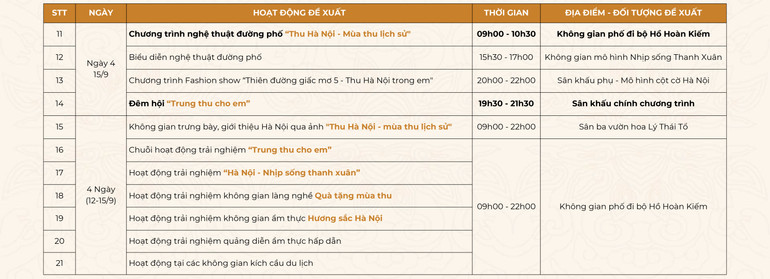 Các hoạt động sẽ được diễn ra trong 4 ngày, thời gian hoạt động diễn ra từ 9 giờ tới 22 giờ (ngày 12-15/9) để phục vụ du khách và người dân Thủ đô. Festival Thu Hà Nội 2024 đem tới cho du khách tham quan hơn 20 hoạt động trải nghiệm. Bên cạnh đó các không gian được bố trí thành các khu vực riêng, tạo điểm nhấn, có sự liên kết, nhằm nổi bật lên chủ đề năm nay "Thu Hà Nội - Mùa thu lịch sử".