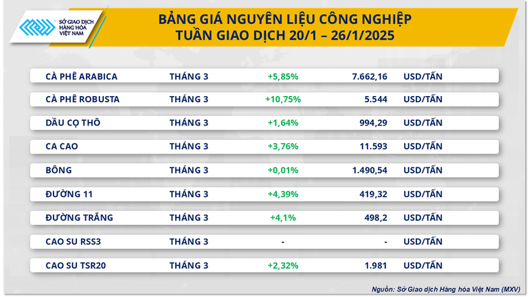 Thị trường nguyên liệu công nghiệp kết thúc tuần giao dịch trong sắc xanh tích cực, với những diễn biến đáng chú ý trên thị trường cà-phê. Cụ thể, giá cà-phê Arabica tăng mạnh 5,85%, xác lập đỉnh giá mới ở mức 7.662 USD/tấn, trong khi giá cà-phê Robusta cũng ghi nhận mức tăng ấn tượng gần 10,8%, chạm ngưỡng 5.544 USD/tấn, thấp hơn 21 USD so với mốc lịch sử được ghi nhận vào phiên giao dịch ngày 28/11 năm ngoái là 5.565 USD/tấn. Như vậy, chỉ sau 5 phiên giao dịch giá tăng liên tiếp, kể từ ngày ông Donald Trump nhậm chức Tổng thống Mỹ, giá cà-phê Robusta đã tăng gần 400 USD/tấn.