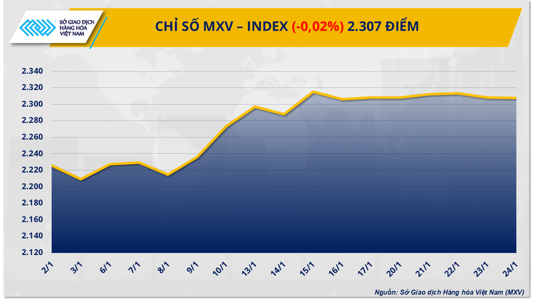 Theo MXV, thị trường hàng hóa nguyên liệu diễn biến phân hóa mạnh trong tuần vừa qua. Đóng cửa, lực bán chiếm ưu thế kéo chỉ số MXV-Index giảm nhẹ 0,02% và dừng lại mốc 2.307 điểm.