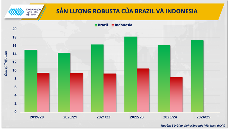 Tại Việt Nam, Hiệp hội Cà-phê Ca-cao (VICOFA) dự báo sản lượng vụ 23/24 giảm thêm 10% so vụ trước đó, về khoảng 1,6 triệu tấn (tương đương 26-27 triệu bao loại 60kg). Trong khi đó, sản lượng Robusta của Indonesia giảm về mức thấp nhất 12 năm, với khoảng 8,4 triệu bao trong niên vụ hiện tại.