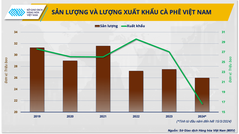 Tại thị trường Việt Nam, lượng cà-phê trong tay nông dân gần như đã cạn kiệt, tình hình mua bán trở nên ảm đạm kể từ đầu năm 2024. Điều này đến sớm hơn so mọi năm, khiến lo ngại thiếu hụt cà-phê trong những tháng tới trở nên nghiêm trọng hơn. Lũy kế 5 tháng rưỡi đầu vụ 23/24, nước ta đã xuất khẩu gần 1 triệu tấn cà-phê, tăng 15-20% so các năm trước. Trong khi, VICOFA dự kiến xuất khẩu cà-phê năm 2024 của Việt Nam giảm mạnh 20% so năm trước, xuống còn khoảng 1,3 triệu tấn.