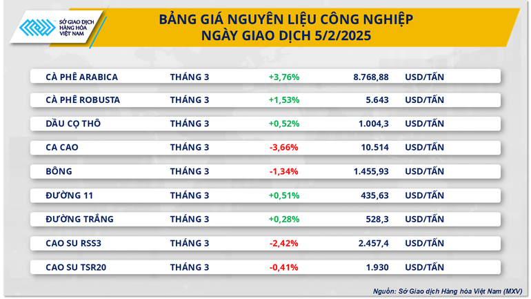 Theo MXV, thị trường hàng hóa nguyên liệu thế giới tiếp tục biến động mạnh trong phiên giao dịch ngày hôm qua (5/2). Thị trường cà-phê tiếp tục gây sự chú ý đặc biệt của giới đầu tư khi chứng kiến chuỗi tăng giá dài nhất trong vòng khoảng 45 năm qua. Trong đó, giá cà-phê tiếp đà bật tăng gần 4% lên 8.768 USD/tấn. Ở chiều ngược lại, giá hai mặt hàng dầu thô cùng nhau suy yếu trong bối cảnh tồn kho tại Mỹ tăng.