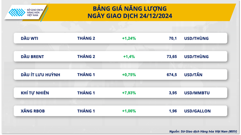 Phiên giao dịch ngày hôm qua kết thúc sớm để các Sở Giao dịch lớn trên thế giới nghỉ lễ Giáng sinh. Ghi nhận mức giá đóng cửa vào khoảng 2 giờ sáng 25/12 giờ Việt Nam, giá dầu thô Brent đi lên 1,4%, đạt 73,65 USD/thùng, trong khi đó, giá dầu thô WTI cũng tăng 1,24% lên 70,1 USD/thùng.