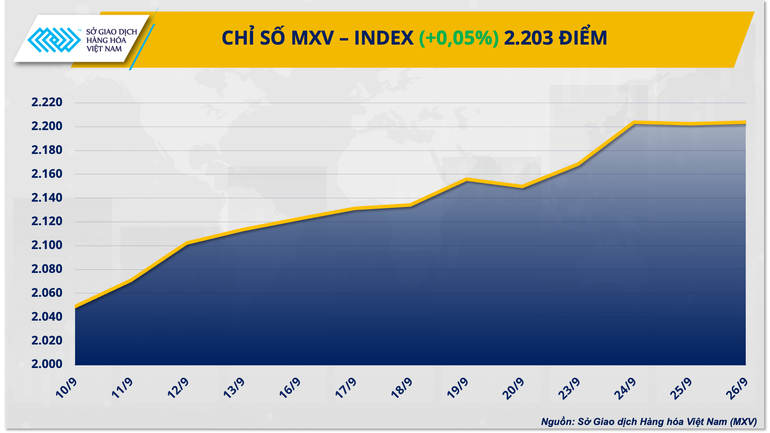 Theo Sở Giao dịch Hàng hóa Việt Nam (MXV), thị trường hàng hóa nguyên liệu diễn biến giằng co và phân hóa trong ngày giao dịch hôm qua (26/9). Đóng cửa, lực mua chiếm ưu thế kéo chỉ số MXV-Index tăng thêm 0,05% lên mức 2.203 điểm.