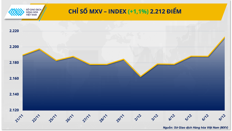 Đóng cửa, chỉ số MXV-Index tăng 1,1% lên 2.212 điểm. Đáng chú ý, nhóm năng lượng dẫn dắt đà tăng của toàn thị trường khi toàn bộ 5 mặt hàng đồng loạt tăng giá.