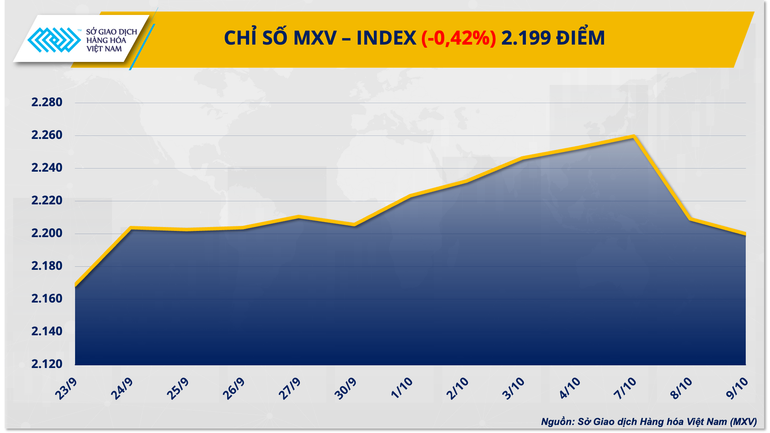 Đóng cửa, lực bán tiếp tục chiếm ưu thế kéo chỉ số MXV-Index đánh mất 0,42% về mức 2.199 điểm.