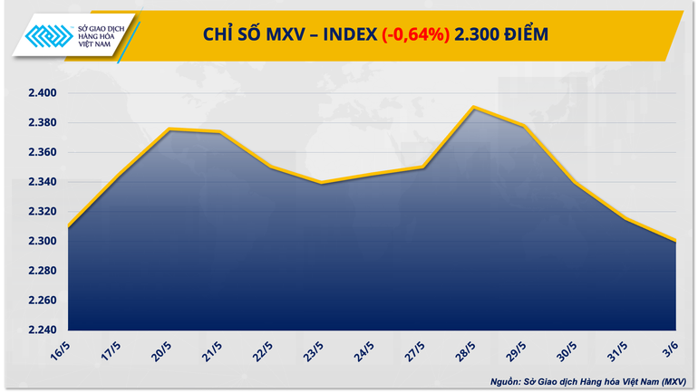 Theo Sở Giao dịch Hàng hóa Việt Nam (MXV), đóng cửa ngày giao dịch đầu tuần (3/6), sắc xanh đỏ đan xen trên bảng giá hàng hóa nguyên liệu thế giới. Lực bán có phần áp đảo, kéo chỉ số MXV-Index suy yếu 0,64% xuống 2.300 điểm, thấp nhất trong gần 3 tuần trở lại đây, đồng thời nối dài chuỗi giảm sang ngày thứ 4 liên tiếp.