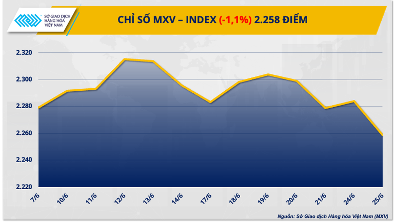 Theo thông tin từ Sở Giao dịch Hàng hóa Việt Nam (MXV), phiên giao dịch ngày 25/6 đã chứng kiến sự sụt giảm mạnh mẽ của giá hàng hóa nguyên liệu toàn cầu. Lực bán chiếm ưu thế ở cả 4 nhóm mặt hàng nông sản, nguyên liệu công nghiệp, kim loại và năng lượng. Điều này đã kéo chỉ số MXV-Index giảm 1,1% về mức 2.258 điểm, chạm mức thấp nhất kể từ đầu tháng 5.