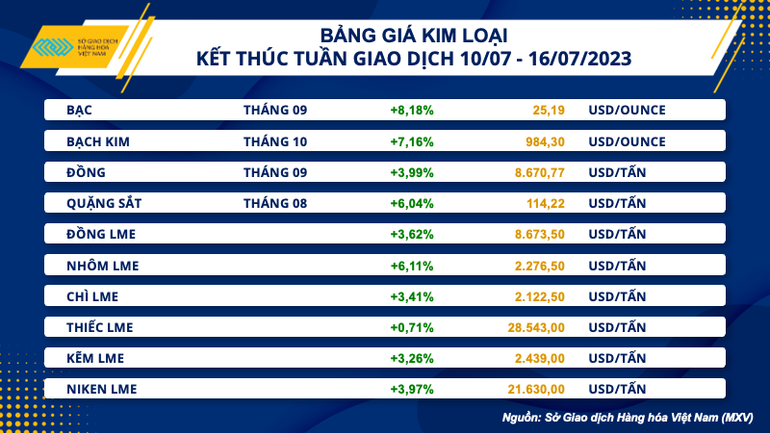 Kết thúc tuần 10/7-16/7, giá bạc dẫn dắt đà tăng của nhóm khi tăng 8,18% lên 25,19 USD/ounce, đánh dấu tuần tăng giá mạnh nhất kể từ giữa tháng 3. Giá bạch kim đóng cửa tuần tại 984,3 USD/ounce sau khi tăng 7,16%, mức tăng trong tuần lớn nhất trong vòng 4 tháng trở lại đây.