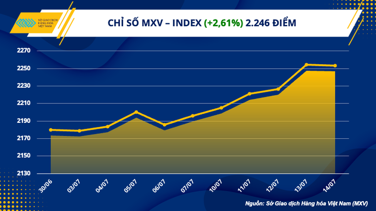 Số liệu từ Sở Giao dịch Hàng hóa Việt Nam (MXV) cho thấy, thị trường hàng hóa nguyên liệu thế giới vừa đóng cửa tuần giao dịch hết sức sôi động với lực mua hoàn toàn áp đảo. Đà tăng mạnh trên cả 4 nhóm mặt hàng đã hỗ trợ chỉ số MXV-Index tăng 4 trên 5 phiên trong tuần và chốt tuần với tổng lũy kế tăng 2,61% lên 2.246 điểm, vùng điểm cao nhất trong hơn 3 tuần trở lại đây.