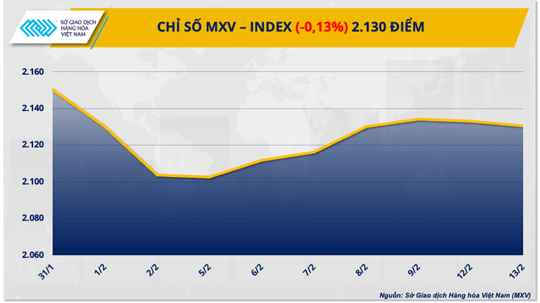 Trong khi đó, nhiều mặt hàng nhóm kim loại và nguyên liệu công nghiệp đảo chiều giảm giá mạnh trong phiên tối sau khi Mỹ công bố dữ liệu lạm phát tháng 1. Chỉ số MXV-Index rơi nhẹ 0,13% xuống 2.130 điểm. Giá trị giao dịch toàn Sở ở mức hơn 2.800 tỷ đồng. Trong đó, riêng nhóm năng lượng chiếm tới 36% tổng giá trị giao dịch.