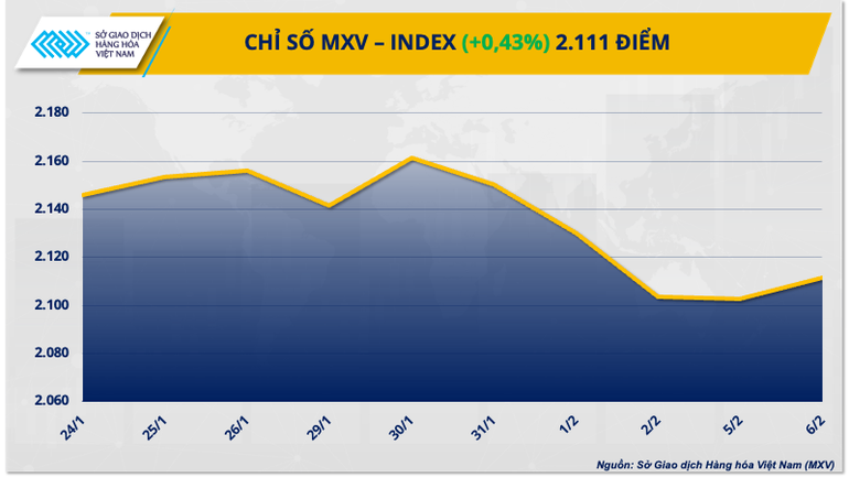 Số liệu từ Sở Giao dịch Hàng hóa Việt Nam (MXV) cho thấy sắc xanh áp đảo trên thị trường hàng hóa nguyên liệu trong ngày giao dịch 6/2. Chốt ngày, chỉ số MXV-Index toàn bộ 4 nhóm hàng đều tăng, kéo chỉ số MXV-Index cao hơn 0,45% lên 2.111 điểm, kết thúc chuỗi giảm 4 ngày liên tiếp trước đó. Giá trị giao dịch toàn Sở ở mức 3.748 tỷ đồng.