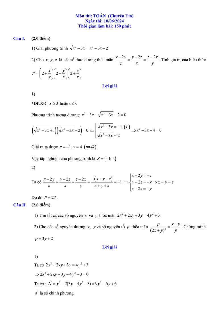 Lời giải chi tiết đề Toán thi vào lớp 10 chuyên Tin của Hà Nội năm học 2024-2025 do các giáo viên nhóm Toán tiểu học - THCS - THPT Việt Nam thực hiện. Thí sinh dùng để tham khảo.