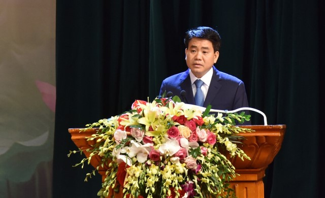 Đồng chí Nguyễn Đức Chung, Chủ tịch UBND thành phố phát biểu tại hội nghị.