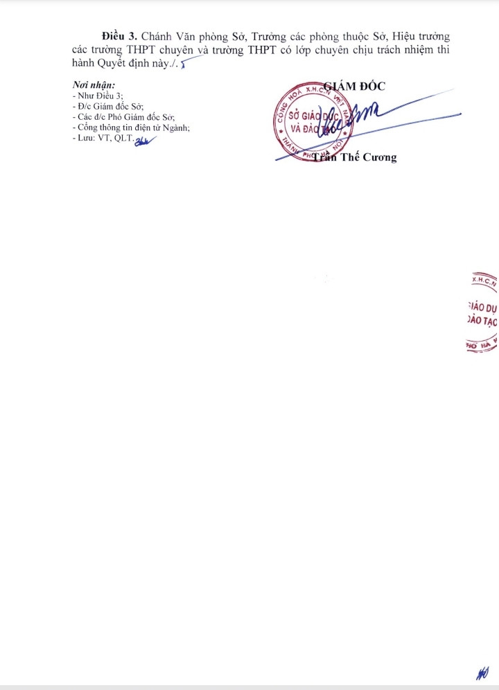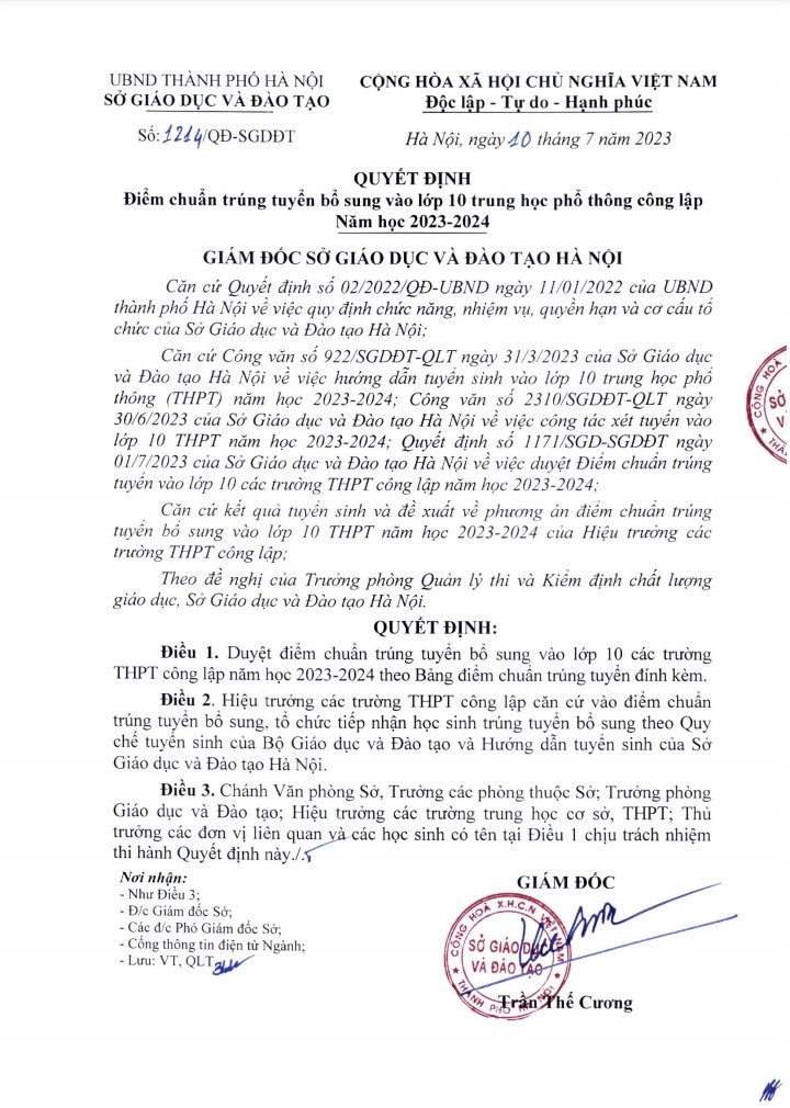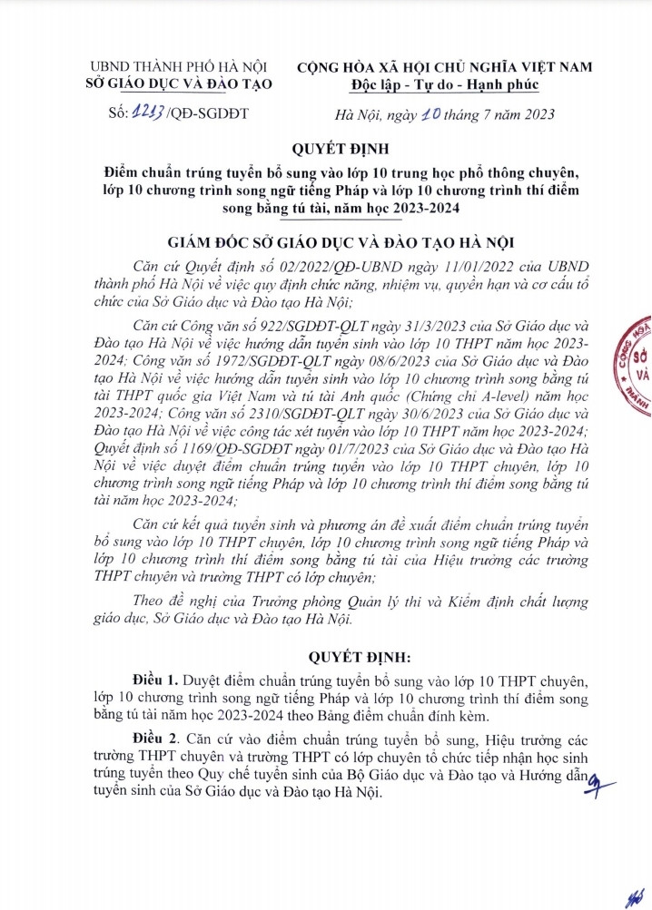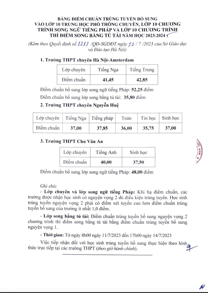 Cùng ngày, Sở Giáo dục và Đào tạo Hà Nội công bố điểm chuẩn trúng tuyển bổ sung vào lớp 10 THPT chuyên, lớp 10 chương trình song ngữ Tiếng Pháp và lớp 10 chương trình thí điểm song bằng tú tài năm học 2023-2024 đối với Trường THPT chuyên Hà Nội-Amsterdam, Trường THPT chuyên Nguyễn Huệ, Trường THPT Chu Văn An.