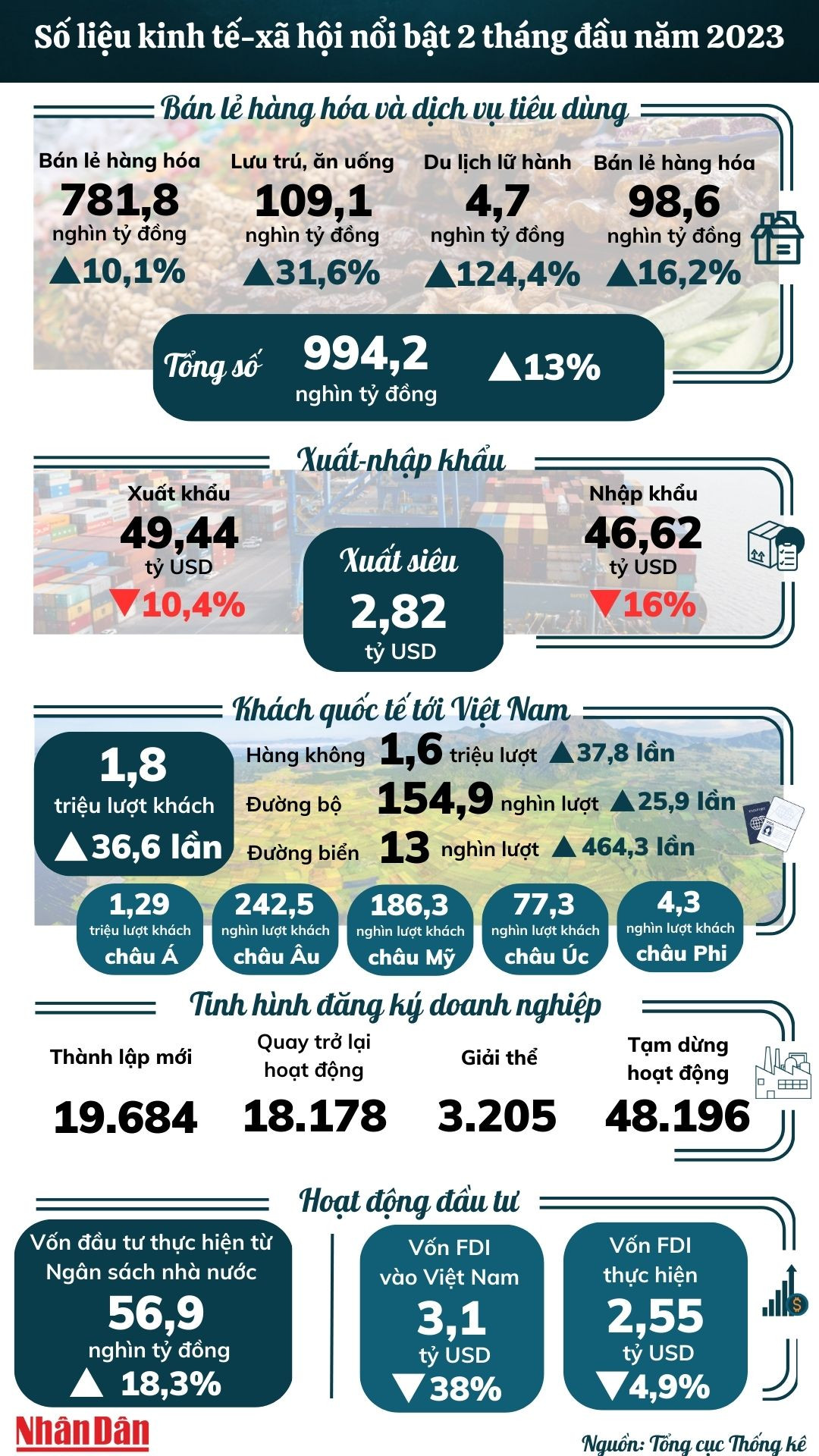 Theo số liệu được Tổng cục Thống kê công bố ngày 28/2, cán cân thương mại hàng hóa hai tháng đầu năm 2023 ước tính xuất siêu 2,82 tỷ USD.