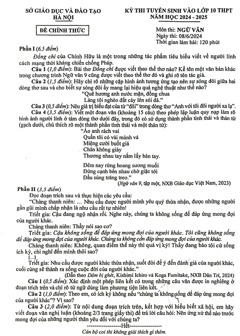 Hình ảnh đề thi Ngữ văn kỳ thi tuyển sinh vào lớp 10 năm học 2024-2025 của Hà Nội: