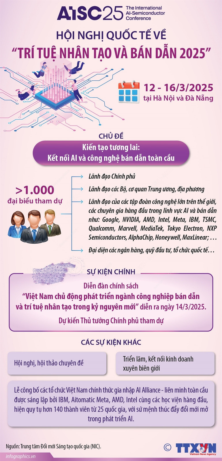 Dự kiến có hơn 1.000 lãnh đạo, chuyên gia dự Hội nghị, trong đó có Lãnh đạo Chính phủ, Lãnh đạo các Bộ, cơ quan Trung ương và địa phương, đại biểu quốc tế (trong đó có nhiều đại diện lãnh đạo của các tập đoàn công nghệ lớn trên thế giới, chuyên gia hàng đầu trong lĩnh vực AI và bán dẫn tham dự. Sự kiện do Trung tâm Đổi mới Sáng tạo quốc gia (NIC) phối hợp Tổ chức Aitomatic (Hoa Kỳ) đồng tổ chức.
