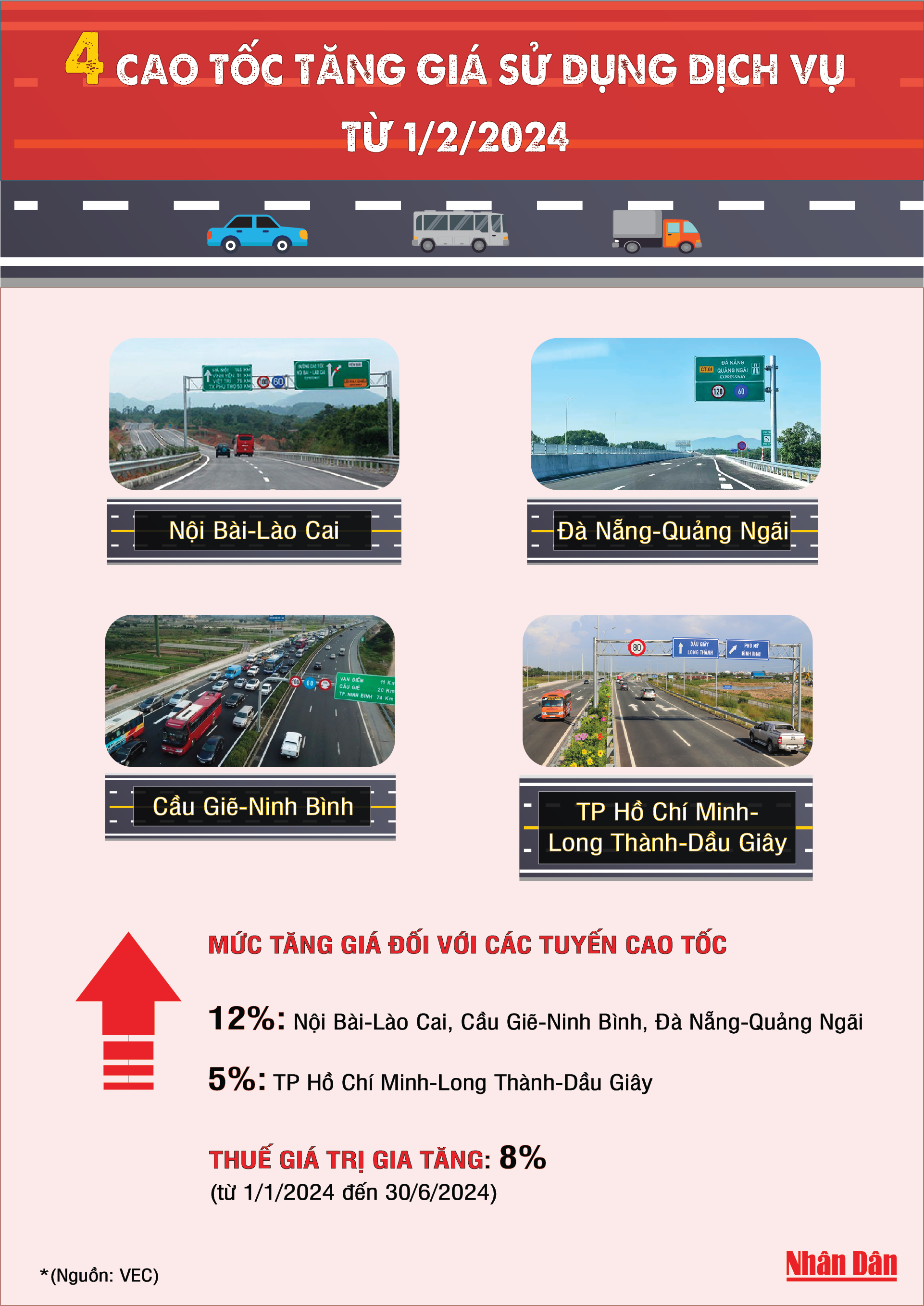 Chi tiết bảng mức giá dịch vụ sử dụng các tuyến đường cao tốc (đã bao gồm 8% VAT)