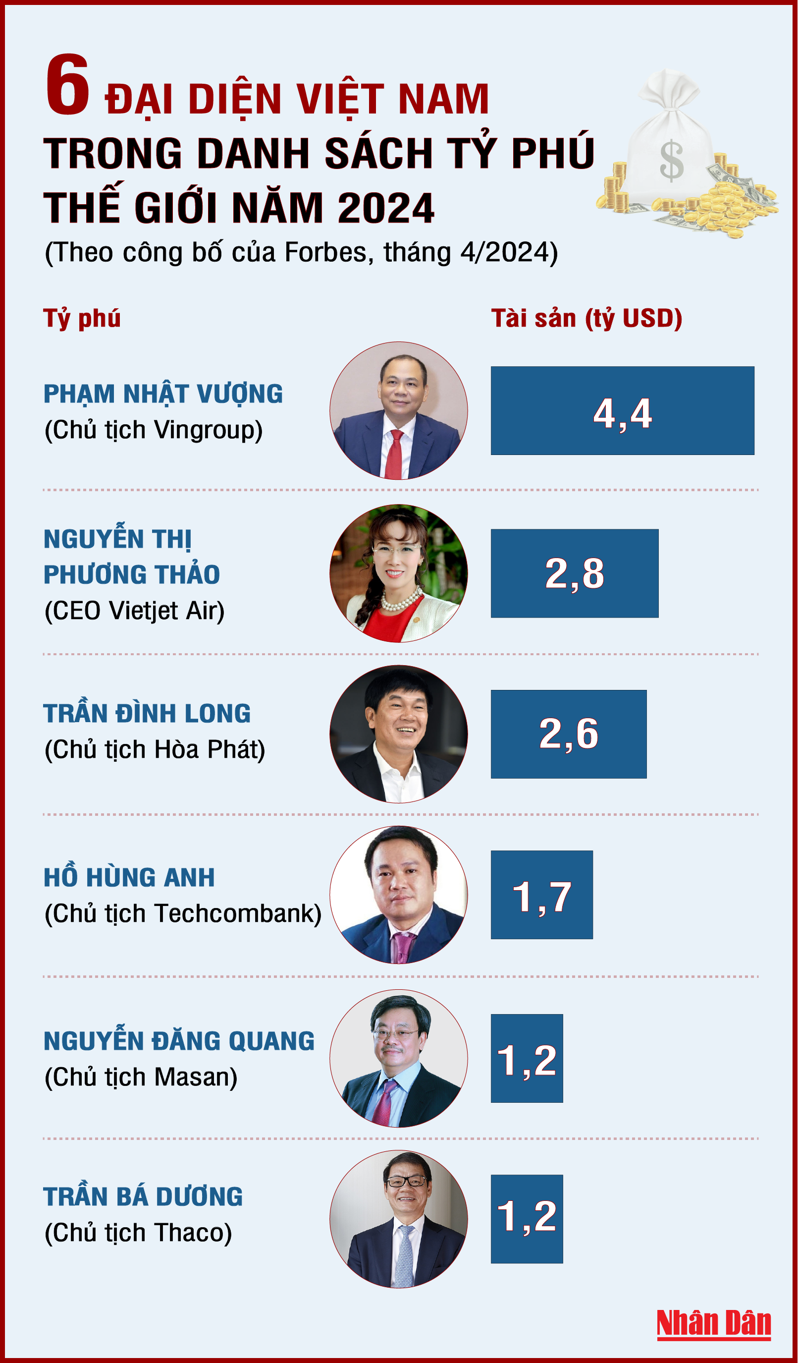 Việt Nam có 6 đại diện trong danh sách những người giàu nhất thế giới do Forbes công bố đầu tháng 4/2024.