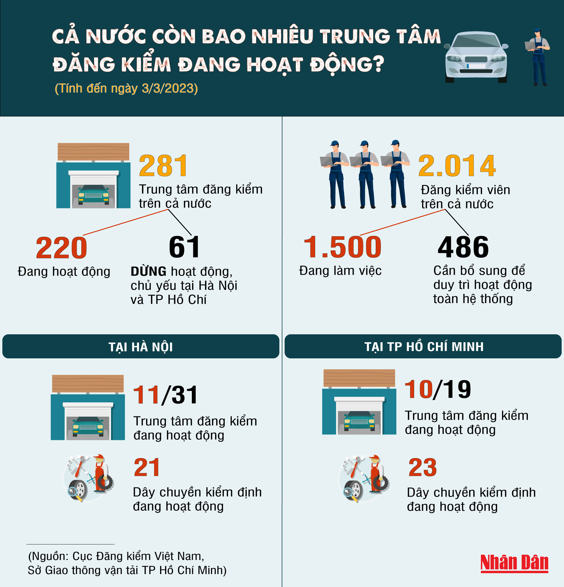 Theo Cục Đăng kiểm Việt Nam, tính đến ngày 3/3, cả nước có 281 trung tâm đăng kiểm với 489 dây chuyền kiểm định, trong đó có 61 trung tâm tạm dừng hoạt động, tập trung nhiều nhất tại Hà Nội và Thành phố Hồ Chí Minh.