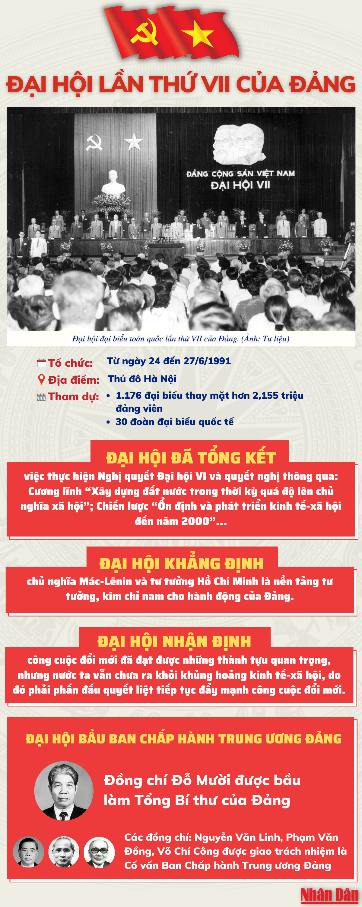 Đại hội lần thứ VII của Đảng được tổ chức từ ngày 24 đến 27/6/1991 tại Hà Nội với sự tham dự của 1.176 đại biểu thay mặt hơn 2,155 triệu đảng viên. Dự Đại hội có 30 đoàn đại biểu quốc tế.