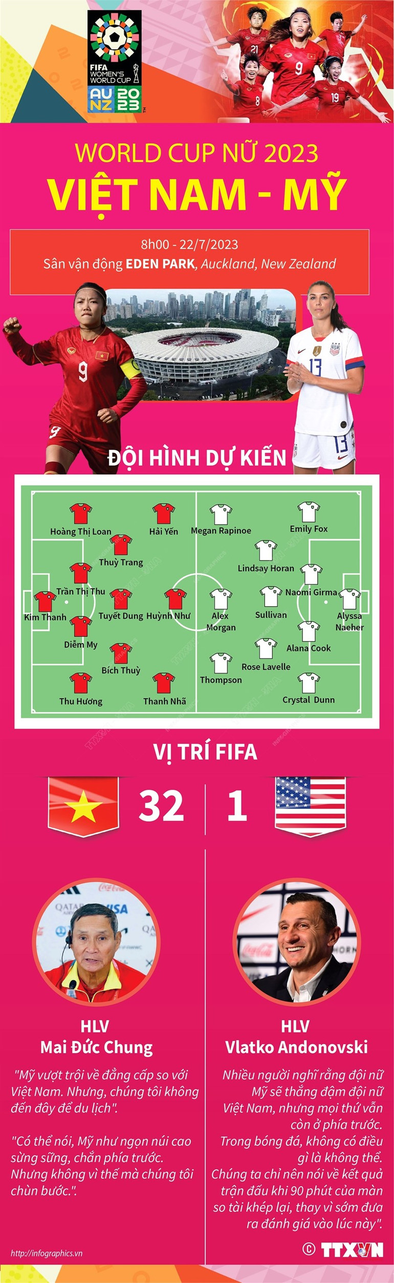 Mỹ hiện là đội bóng số một thế giới, đã 4 vô địch World Cup Nữ, còn đội tuyển Việt Nam hiện đứng thứ 32, lần đầu tiên tham dự World Cup Nữ.